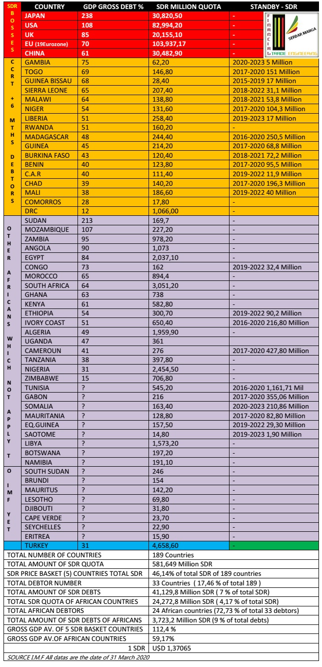 2012 den buyana yüzlerce kez dile getrdiğim 2016-2020 adaptasyon/2020-2036 mitigation (azaltım) kodlu yeni küresel sosyoiktisadi düzen; Corona-Covid19 salgınının küresdel ekonomi üzerinde yaratacağı tsunami nedeniyle şimdi tüm ülkelerin öncelikli maddesi. Tüm aklı başında devletler yıkımı minimum şiddetle atlatmak ve yeni sisteme giriş için ardıardına ekonomik paketler açıklıyor ve buna postcovid adı veriliyor. Bu durumda tüm gözler tefeci statüsünde olsa dahi IMF'e çevrilmiş durumda. 15/04 itibarıyla 100 ülkenin kredi müracaatı yaptığını bizzat IMF açıkladı. Türkiye bu ülkeler içinde değil. Çünkü görmekten gayet mutluyumki; her fırsatta dünya 5'ten büyüktür diyerek SDR sepetini oluşturan 5 ülkenin dünya ekonomilerini nasıl bozguna uğrattığını dile getiren Erdoğan ve ekonomi kurmayları aşağıdaki tablodan da göreceğiniz rezilliğin farkındalar. Özelliklede SDR ın 5 yılda bir fiyatlandığını; sepetindeki 5 para biriminin 5 yıl boyunca fix-çapalı kaldığını ama bunun için diğer para birimlerini fazlasıyla salladığını ve en önemlisi SDR ın yeni 5 yıllık fiyatlamasının Kasım 2020'de yapılacağını !!